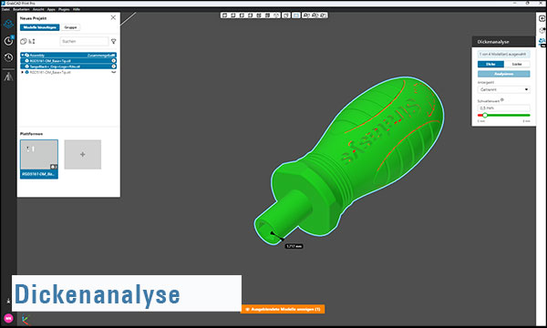 • Schichtstärkenanalyse: Prüft, ob die Teilgeometrie die (anpassbare) Druckerauflösung unterschreitet. Ergebnisdarstellung binär (Rot/Grün) oder als gelb-roter Farbverlauf; per Mauszeiger lassen sich exakte Werte an beliebigen Stellen abfragen.
